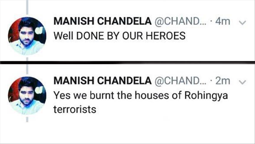 In two tweets reportedly posted by Manish Chandela using the handle @Chandela_BJYM, he admitted to burning the refugee camp.
