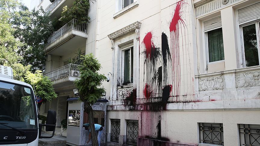 A small group of anarchists threw paint on the walls of Turkey’s Embassy in Athens Tuesday.
