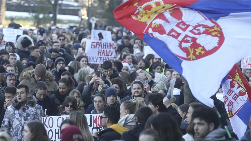 The students gathered in front of the Palace of Justice in the capital city before marching to a key intersection to express their displeasure with the investigation into the incident on Nov. 1, 2024, when a concrete canopy collapsed at a Novi Sad train station, killing 15 people and injuring two more.