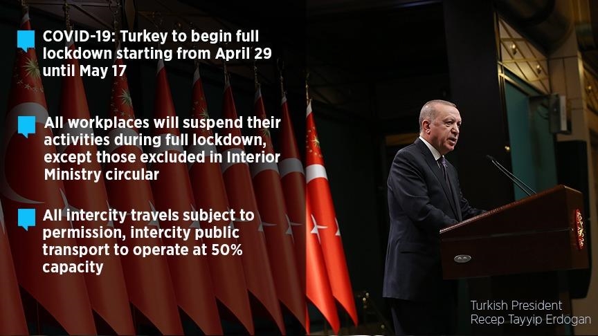 Turkey will enforce a full lockdown from Thursday evening until May 17 to stem the spread of coronavirus, the country's president announced on Monday.