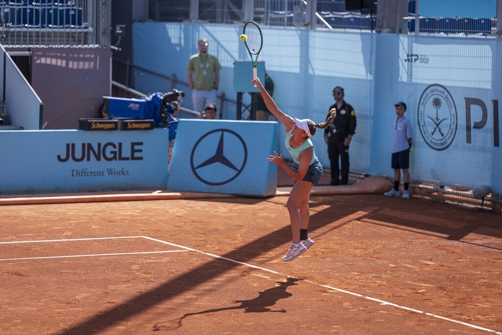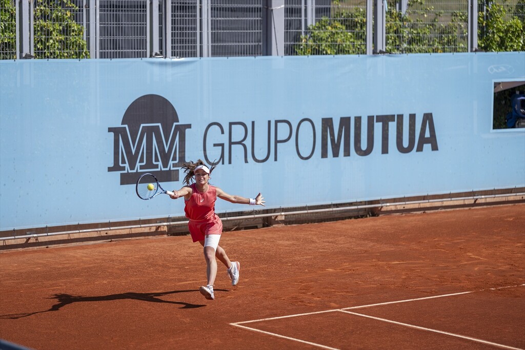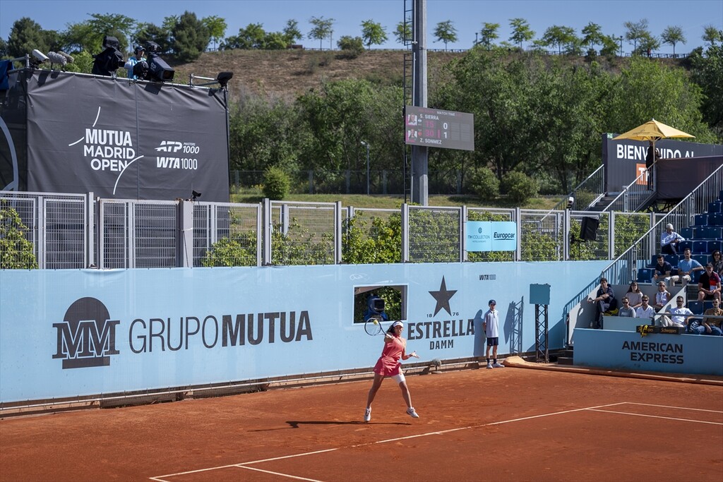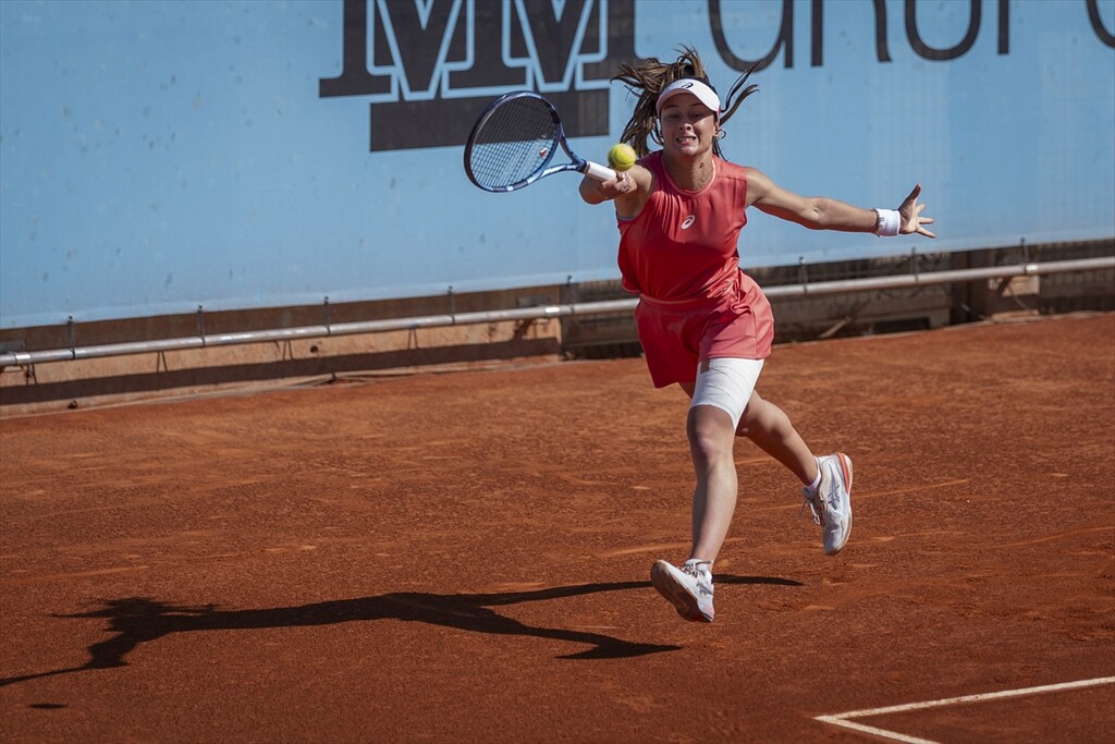 Turkish tennis player Zeynep Sonmez in action against Argentine's Solana Sierra (not seen) during the WTA women's singles third-round match of the Mutua Madrid Open at Caja Magica in Madrid, Spain, on April 26, 2026.