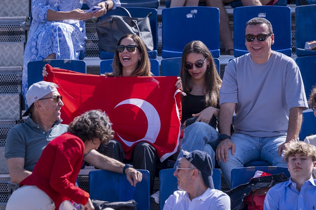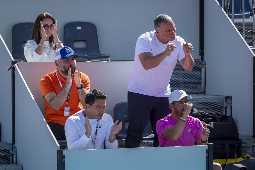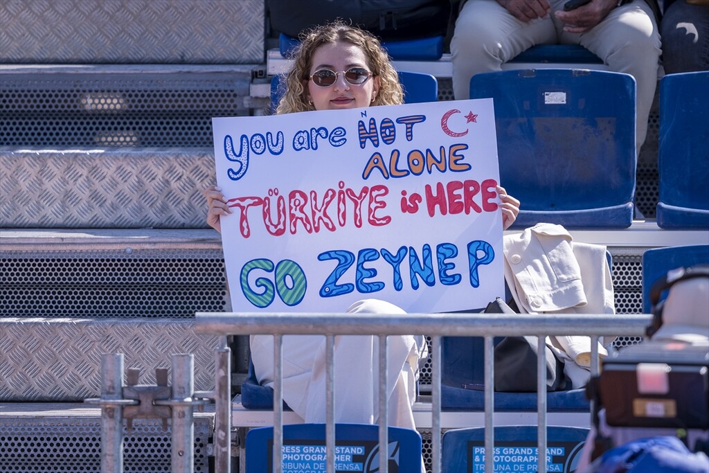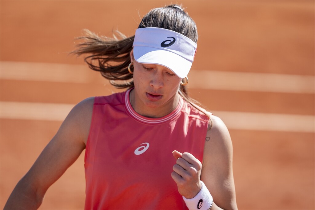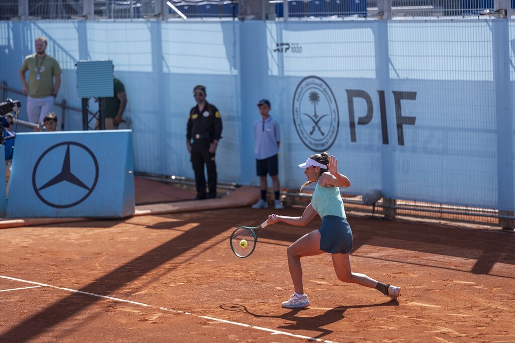 Turkish tennis player Zeynep Sonmez in action against Argentine's Solana Sierra (not seen) during the WTA women's singles third-round match of the Mutua Madrid Open at Caja Magica in Madrid, Spain, on April 26, 2026.