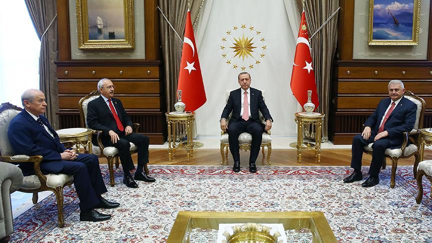 President Recep Tayyip Erdogan met behind closed doors with ruling Justice and Development (AK) Party head and Prime Minister Binali Yildirim, Republican People's Party (CHP) leader Kemal Kilicdaroglu, and Nationalist Movement Party (MHP) head Devlet Bahceli, said presidential spokesman Ibrahim Kalin.