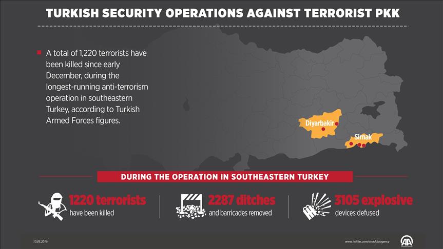 A total of 1,220 terrorists have been killed since early December, during the longest-running anti-terrorism operation in southeastern Turkey, according to Turkish Armed Forces figures.