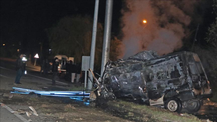 The minibus caught fire after hitting the pole on the Igdir-Kars highway in Igdir province.