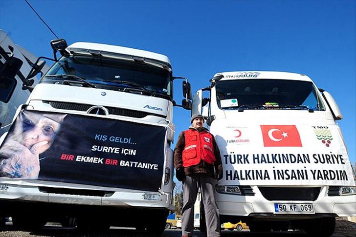 A statement said that 25 trucks from central province of Konya, 12 trucks from northwestern province of Bursa, six from northwestern Sakarya province, one from southern province of Antalya, six from central Kayseri province, four from Ankara, three trucks from southeastern province of Gaziantep, two from northwestern province of Zonguldak, two from central Corum province, five trucks from eastern province of Van, two from Izmir, two trucks from northwestern province of Izmit, seven from Duzce, one from Yalova and one from Balikesir left for Syria.