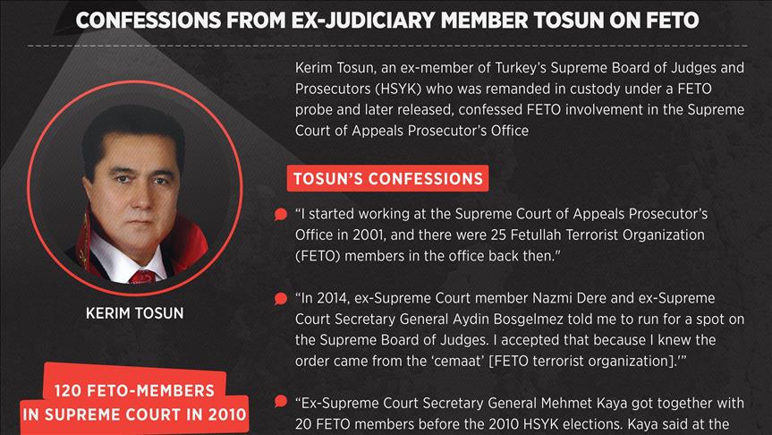 In a detailed confession, an ex-member of Turkey's Supreme Board of Judges and Prosecutors (HSYK) Tuesday told of FETO's involvement in the Supreme Court of Appeals Prosecutor’s Office, according to a judicial source.