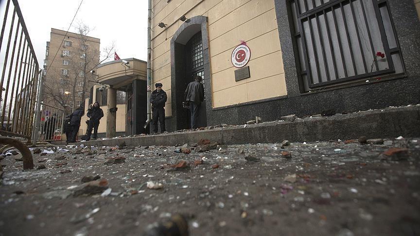 Turkey’s embassy in Moscow has been hit by stones, eggs and paint hurled by a group of protestors.