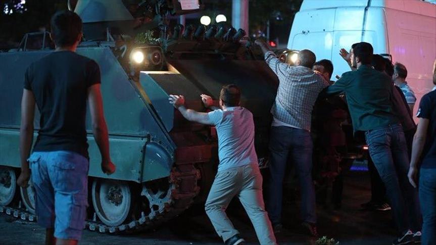 Turks climbing on military tanks in Istanbul; in front of Turkish General Staff HQ in Ankara protesting military coup attempt