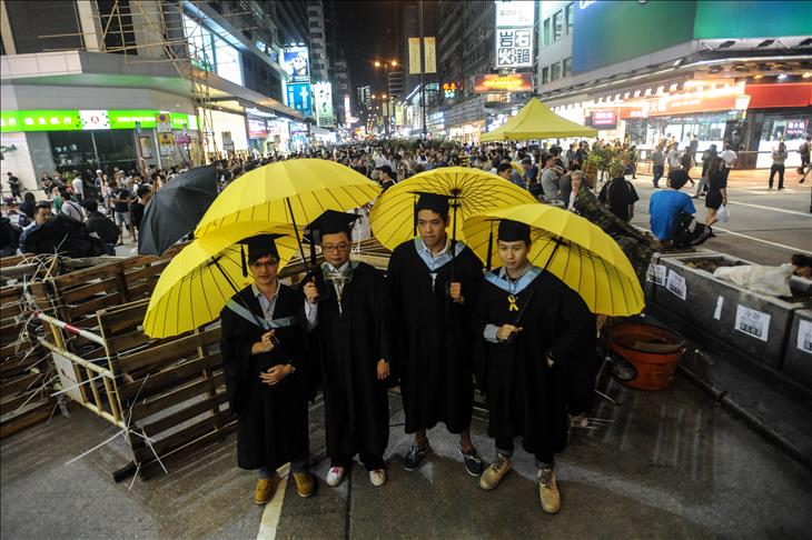 Public broadcaster Radio Television Hong Kong reported Monday that a graduate of Baptist University had knelt in front of Vice-Chancellor Albert Chan and presented him with the umbrella during a weekend ceremony.
