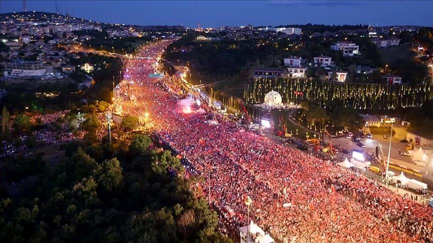 Erdogan bergabung dengan jutaan warga di jembatan Bosphorus, yang kemudian diubah namanya untuk menghormati para martir yang tewas dalam kudeta. Pada malam kudeta, kelompok pengkudeta menutup jembatan tersebut dan puluhan orang terbunuh di sana.