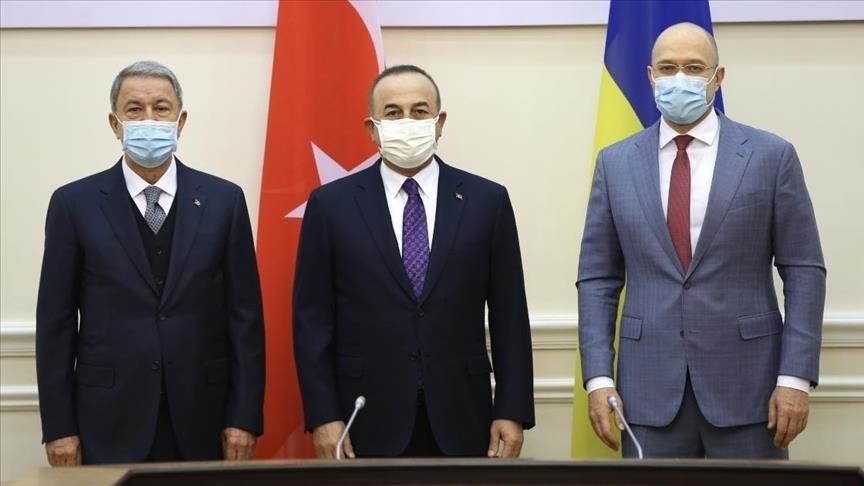 Menteri Luar Negeri Turki Mevlut Cavusoglu dan Menteri Pertahanan Hulusi Akar pada Jumat mengadakan pertemuan dengan Denys Shmyhal di ibu kota Ukraina, Kiev.