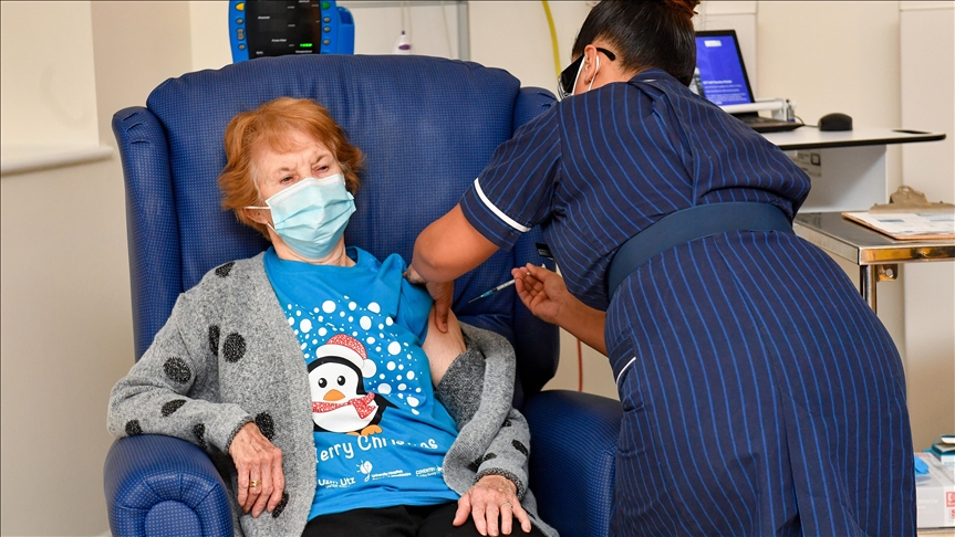 Margaret Keenan, seorang perempuan berusia 90 tahun, adalah orang pertama yang menerima suntikan vaksin di Rumah Sakit Universitas di Coventry.