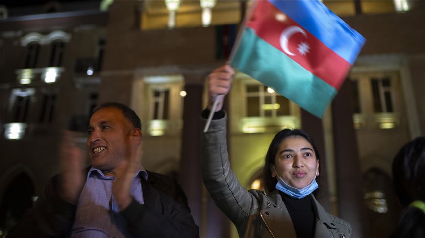 Sejumlah warga di ibu kota, Baku, menyanyikan lagu kebangsaan, menari, dan melakukan konvoi mobil.
