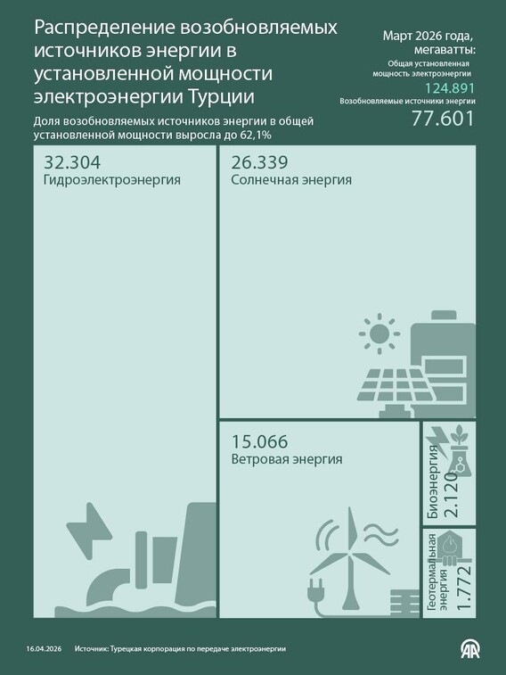 Распределение возобновляемых источников энергии в установленной мощности электроэнергии Турции