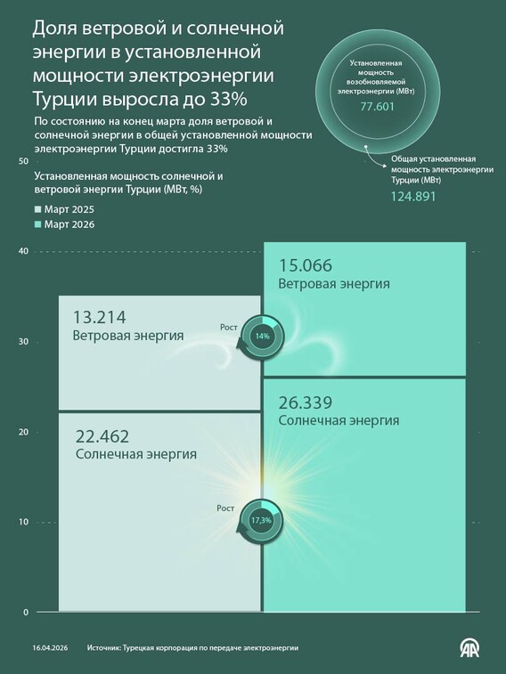 Доля ветровой и солнечной энергии в установленной мощности электроэнергии Турции выросла до 33%