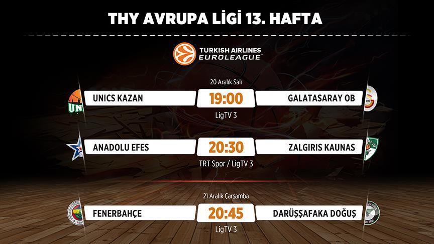 Yeni formatta 4 Türk takımının yer aldığı THY Avrupa Ligi'nde bu hafta içi takımlar ikişer kez parkeye çıkacak. Ligin 13. haftasında Fenerbahçe, Darüşşafaka Doğuş'u, 14. haftasında 22 Aralık Perşembe günü ise Galatasaray Odeabank, Anadolu Efes'i konuk edecek.