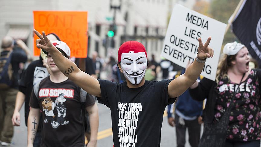 Uluslararası bilgisayar korsanı grubu "Anonymous" organizasyonuyla dünya genelinde birçok kentte aynı gün düzenlenen yürüyüşün Washington ayağına katılan çok sayıda kişi, Washington Anıtı önünde toplandıktan sonra "V for Vendetta" filminde yer alan Guy Fawkes maskeleri takarak ABD Kongresi ve Beyaz Saray'a yürüdü.