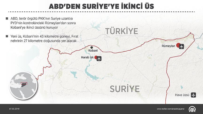 ABD, Suriye'nin kuzeydoğusunda terör örgütü PKK'nın Suriye uzantısı PYD'nin kontrolündeki Rümeylan'dan sonra Ayn el-Arab'ın (Kobani) güneyinde de hava üssü kuracak.