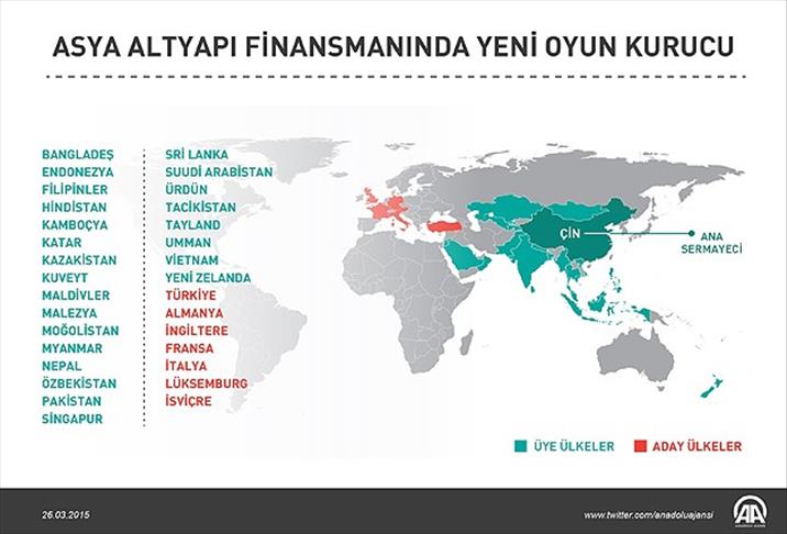 Asya Altyapı Yatırım Bankasına üye olan ve üyelik başvurusunda bulunan ülke sayısı, 26 Mart itibarıyla 33’ü buldu. Çin'in öncülüğünde kurulacak bankaya, Bangladeş, Burma, Kamboçya, Hindistan, Endonezya, Kazakistan, Kuveyt, Malezya, Maldivler, Moğolistan, Myanmar, Nepal, Yeni Zelanda, Umman, Pakistan, Filipinler, Tayland, Suudi Arabistan, Singapur, Sri Lanka, Tacikistan, Özbekistan, Vietnam, Katar ve Ürdün üye oldu.