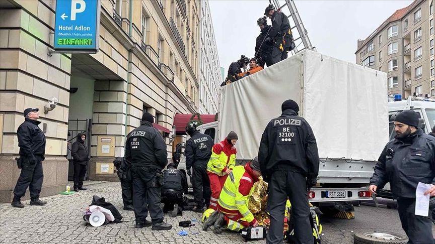 Zirvenin yapıldığı Adlon Oteli çevresinde bir araya gelen aktivistler, otelin kapı ve duvarlarına yeşil boya döktü.