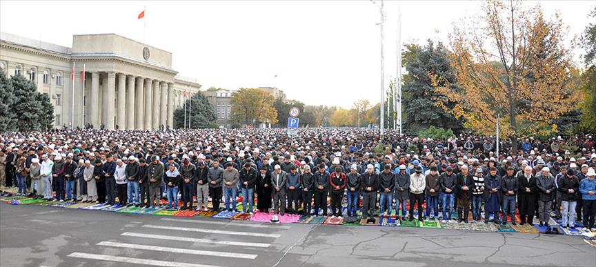 Kırgızistan'ın başkenti Bişkek'te bayram namazını kılmak için her yıl olduğu gibi on binlerce vatandaş Başbakanlık binasının önündeki alanı tercih etti. Meydana sığmayan vatandaşlar, ara sokakları ve park alanlarını doldurdu.