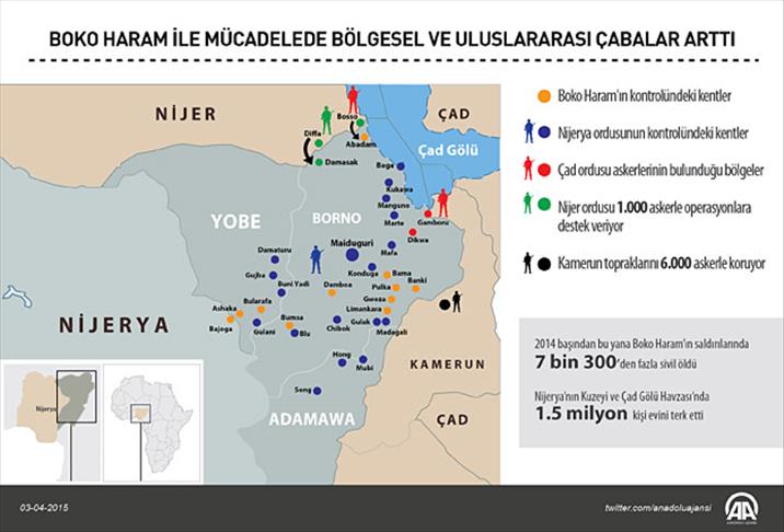 Savunma Bakanlığı Sözcüsü Chris Olukolade, AA muhabirine yaptığı açıklamada "Boko Haram teröristlerinin elinde silah ve mühimmat kalmadı. Artık ellerinde sadece ok, yay ve pala gibi silahlar var. 500 militandan sadece birkaçı tüfek taşıyor. Tüfeği olanların da mermisi yok" ifadelerini kullandı.
