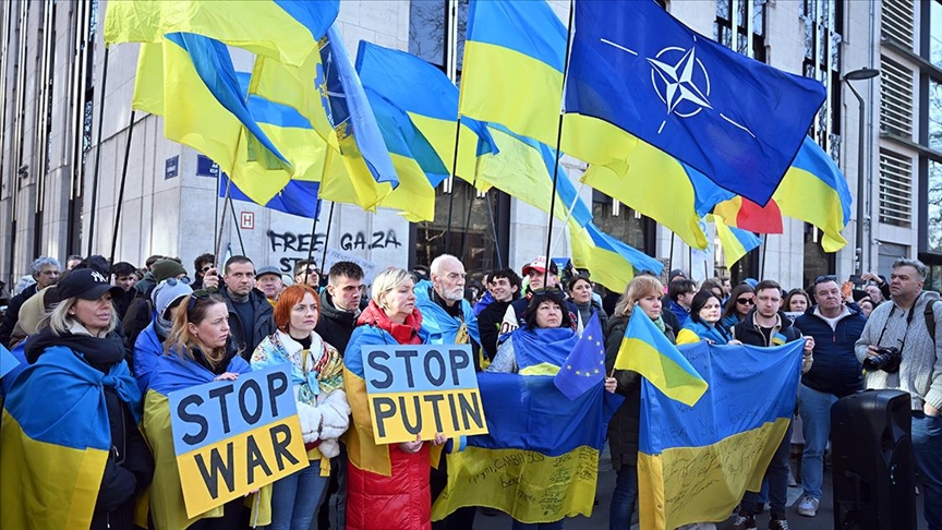 Ukrayna bayrakları taşıyan kalabalık, "Trump, Putin'e hizmet ediyor", "Ukrayna satılık değildir" ve "Düşmanınızın söylemini benimseyerek bir anlaşma yapamazsınız" yazılı pankartlar taşıdı.