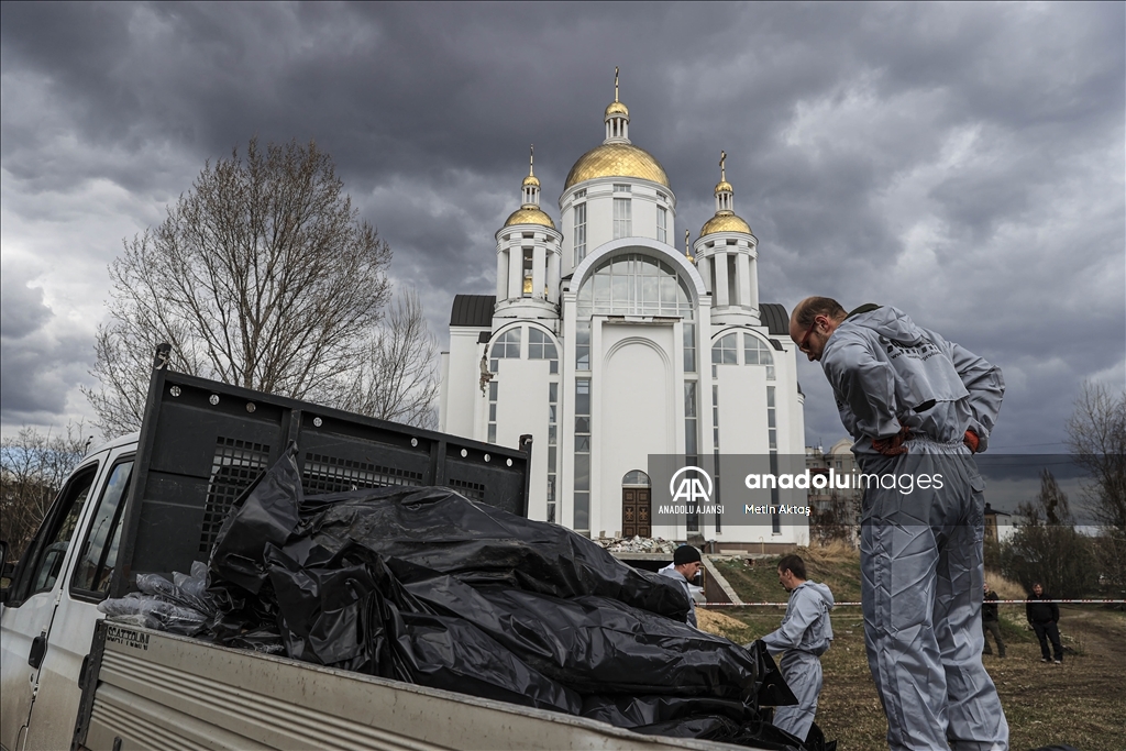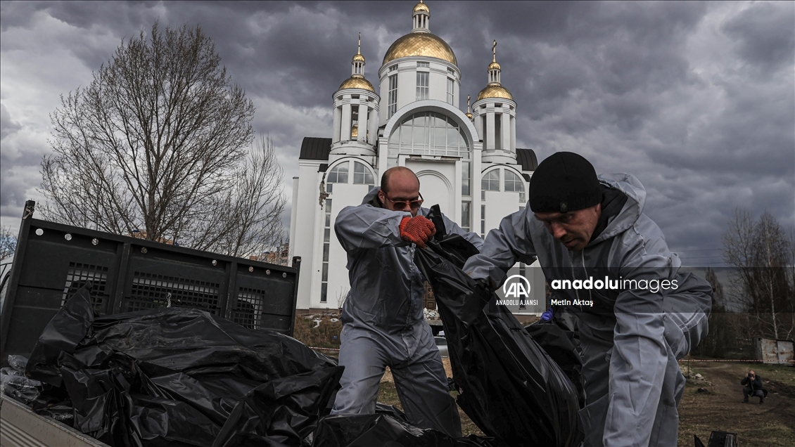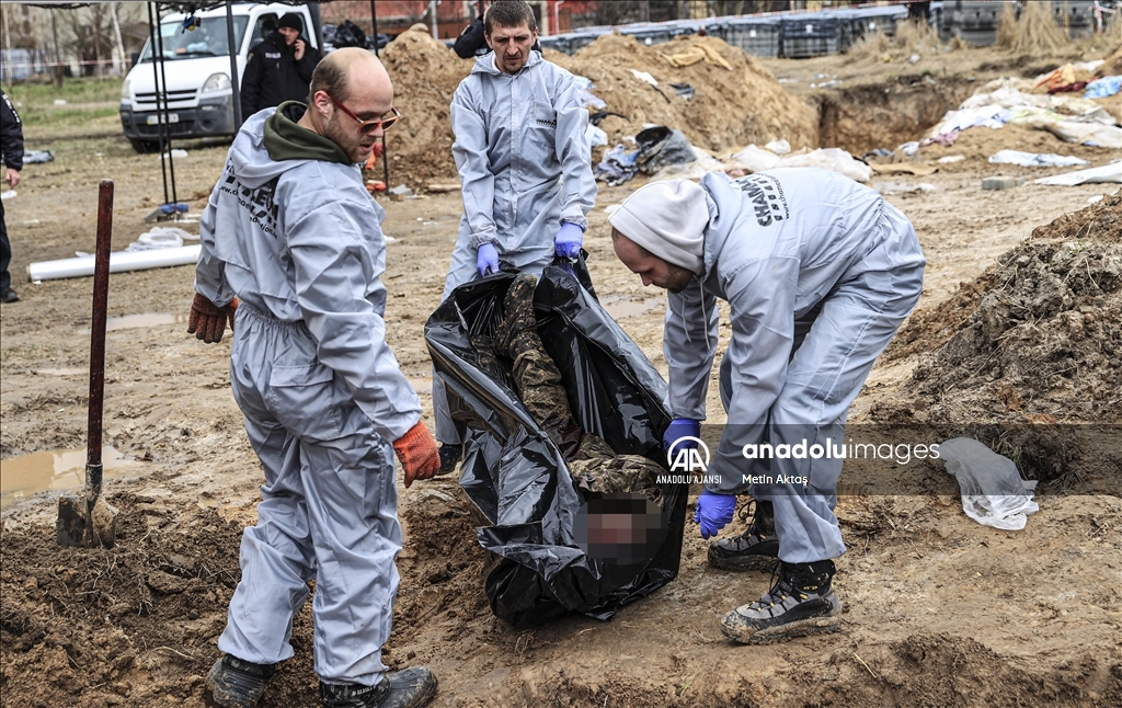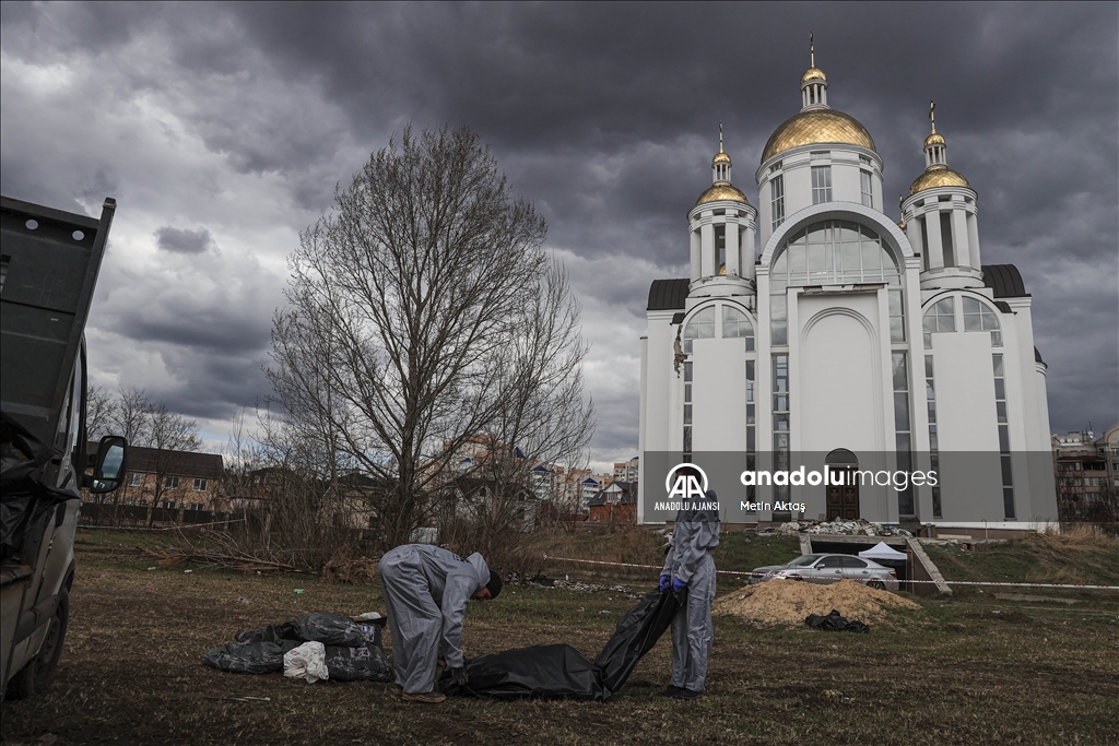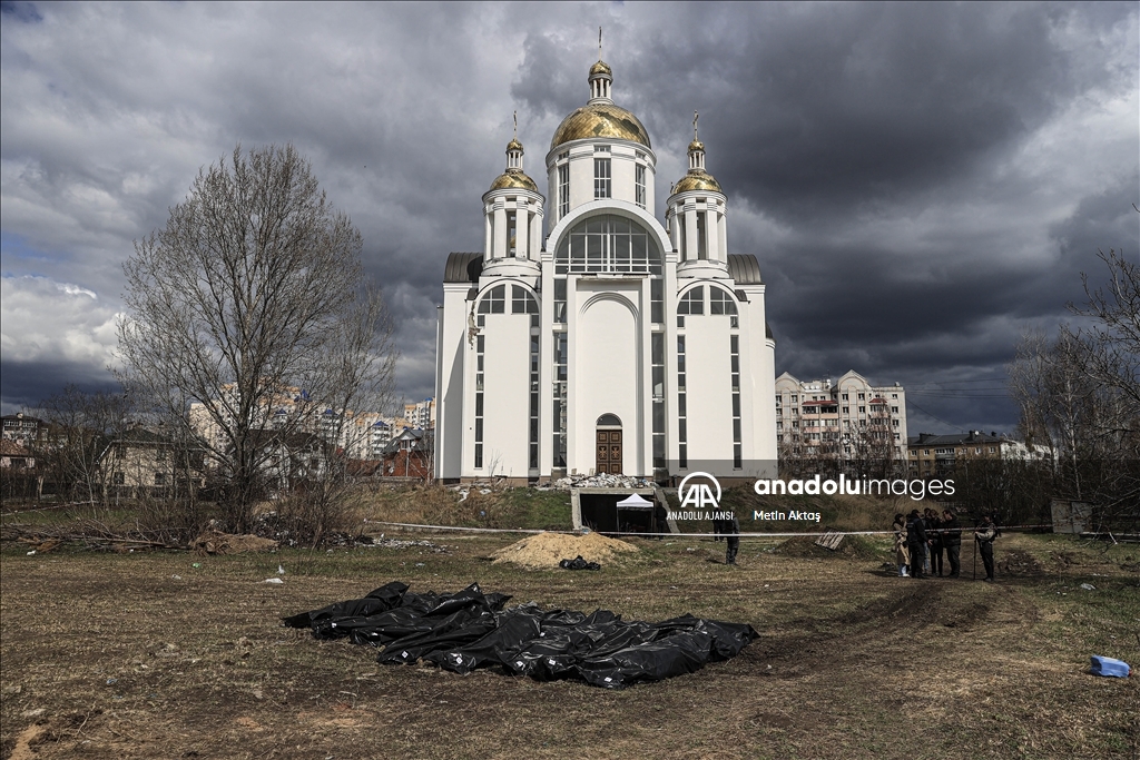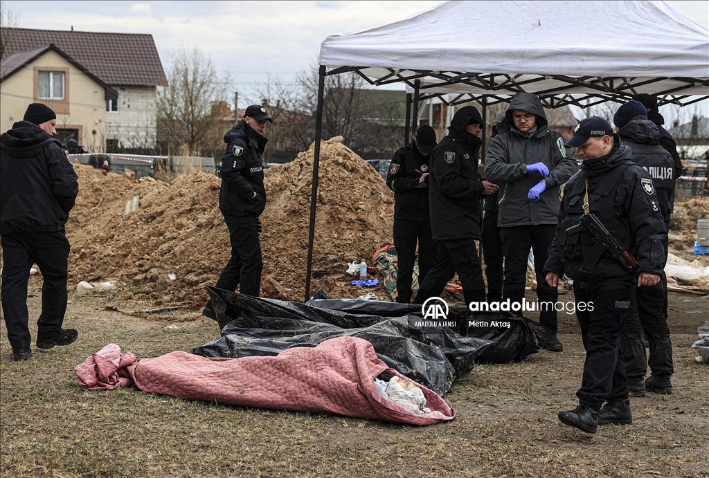 Rus askerleri tarafından öldürüldüğü iddia edilen sivillerin cesetlerinin çıkarılma çalışmaları şehrin Aziz Andria Kilisesi'nin bahçesinde bulunan toplu mezarda 3. gününde de devam etti.