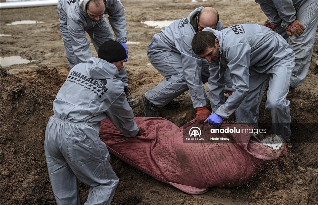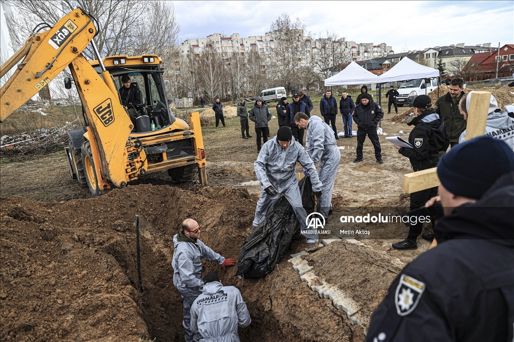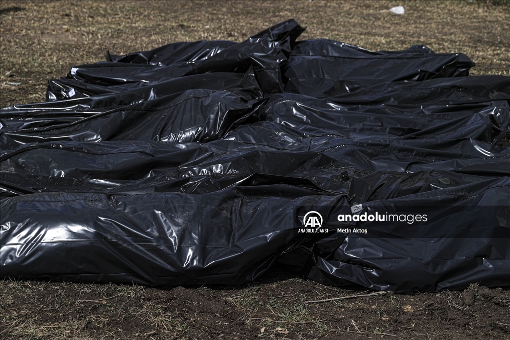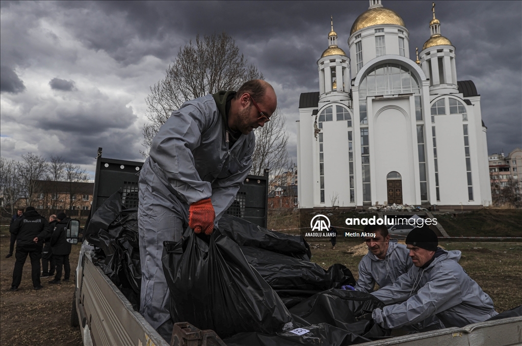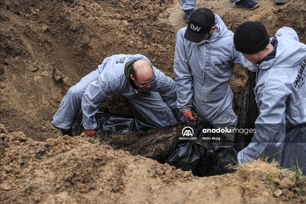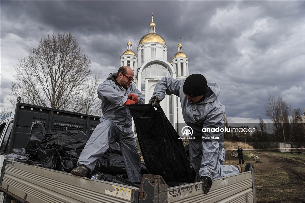 Rus askerleri tarafından öldürüldüğü iddia edilen sivillerin cesetlerinin çıkarılma çalışmaları şehrin Aziz Andria Kilisesi'nin bahçesinde bulunan toplu mezarda 3. gününde de devam etti.