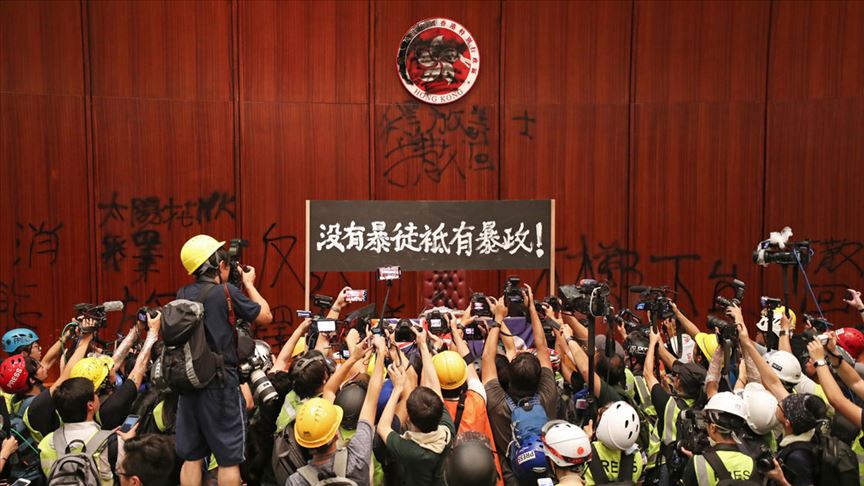 Hong Kong'un yönetiminin İngiltere'den Çin'e devredilişinin 22'nci yıl dönümünde binlerce kişi protestolar için dün sokaklara çıkarken, protestocuların gündeminde kısa süre önce kentte yine büyük gösterilere neden olan ve bu gösteriler nedeniyle askıya alınan zanlıların Çin'e iadesini kolaylaştıran yasal düzenleme vardı. Yasama Meclisi önünde oturma eylemi yapan bir grup protestocu, binanın cam kapılarını ve metal bariyerlerini kırarak içeri girmiş, binada maddi zarara sebep olmuştu. Eylemciler ayrıca, Hong Kong Özel İdare Bölgesi amblemini de renkli spreylerle boyamıştı.