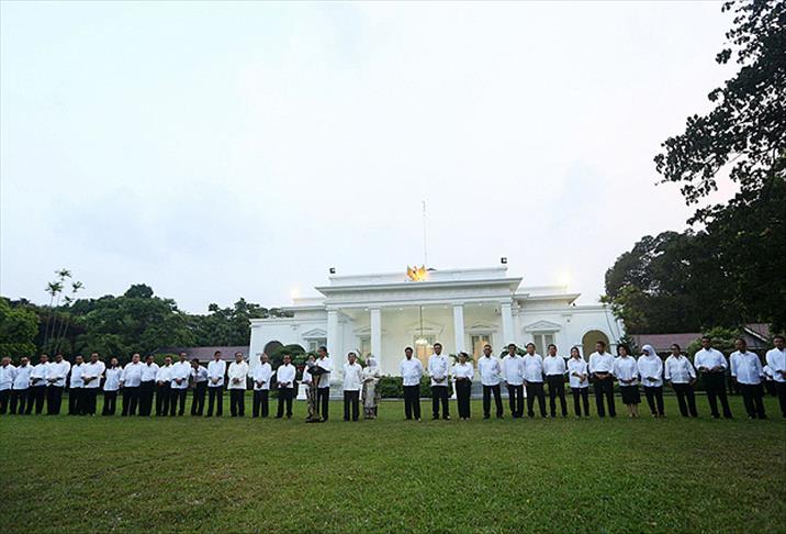 Jokowi ve yardımcısı Yusuf Kalla, yeni kabineyi açıklarken, tüm üyelerin beyaz giyinmesi dikkati çekti. Tek tek sahneye çağrılan yeni bakanlar birbirlerini sarılarak kutladı.