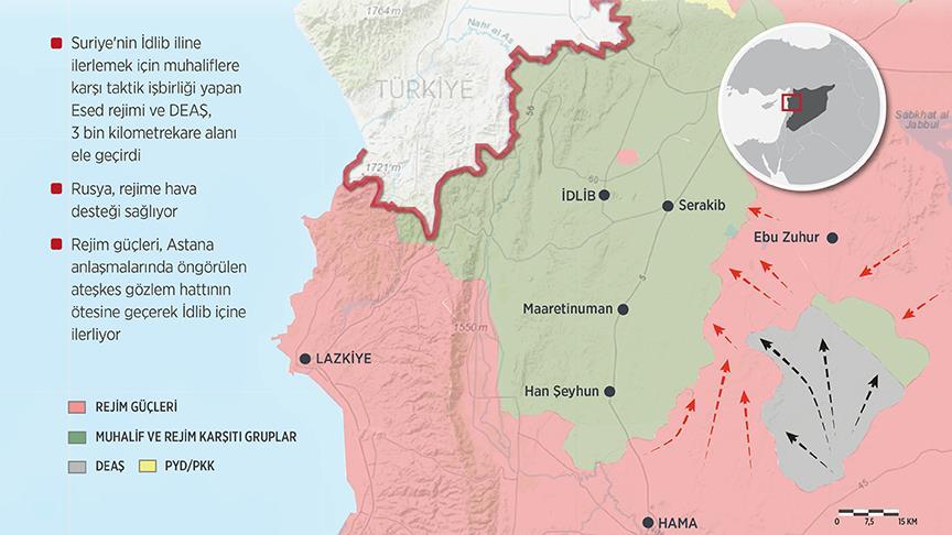AA'nın harita alan ölçümlerine göre, rejim güçleri ve DEAŞ, İdlib'in güneyi ve güneydoğusunda 3 bin 35 kilometrekare alanı ele geçirdi.