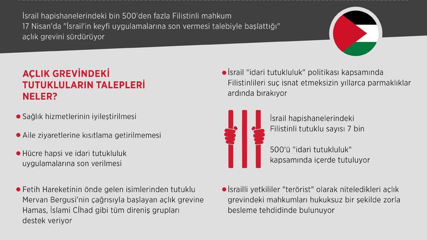 Filistin direnişinin sembol isimlerinden olan ve 15 yıldır cezaevinde bulunan Mervan Bergusi'nin çağrısıyla açlık grevine başlayan Filistinli mahkumlar, 17 Nisan'dan beri sürdürdükleri bu eylemleriyle Tel Aviv yönetimi üzerinde baskı oluşturmaya ve seslerini dünyaya duyurmaya çalışıyor.