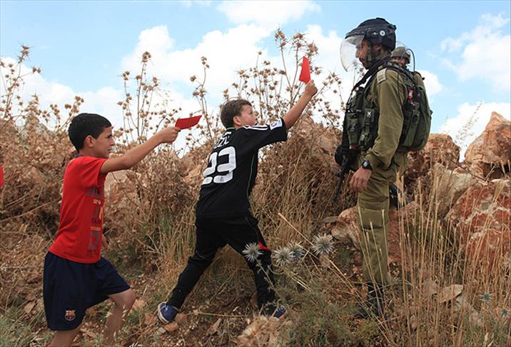 Çocuklar gösteri sebebiyle köyün çevresinde bekleyen İsrail güvenlik güçlerini ''kırmızı kart'' göstererek protesto etti.
