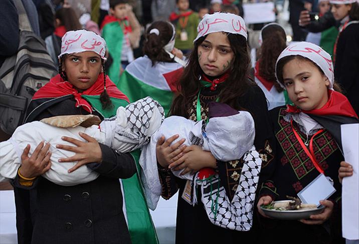 Eyleme katılan Filistinli çocukların, üzerinde "Açım" ve "bize yardım edin" şeklinde yazıların bulunduğu ekmek ve tabaklar taşıması dikkati çekti.