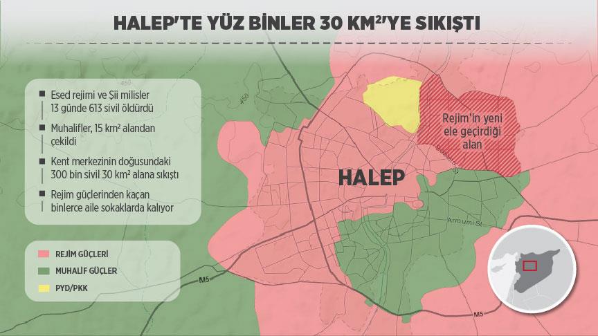 Suriye'nin kuzeyinde, Türkiye'ye sınır Halep ili, başkent Şam'dan sonra ülkenin ikinci büyük kenti konumunda. Kent merkezinin Türkiye sınırına uzaklığı 40 kilometre. Merkezin batısını rejim, doğusunu muhalifler kontrol ediyor. Rejim kuşatmasında yaklaşık 300 bin sivilin bulunduğu doğu Halep'te İl Sağlık Müdürlüğü'nün verilerine göre, halk 95 gündür temel insani ihtiyaçlarını gideremiyor. Son iki hafta içinde kentin doğusundaki tüm hastaneler ve sağlık merkezleri rejim saldırılarıyla hizmet dışı kaldı. Kentte hizmet veren yalnızca 3 fırın bulunuyor. Bölgede okulların tümü kapalı.