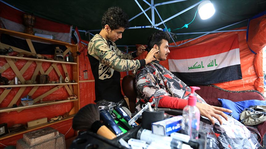 Iraklı genç Hamad Firas da, göstericilere destek vermek amacıyla kurduğu çadırında her gün onlarca kişi için ücretsiz saç ve sakal kesimi yapıyor.