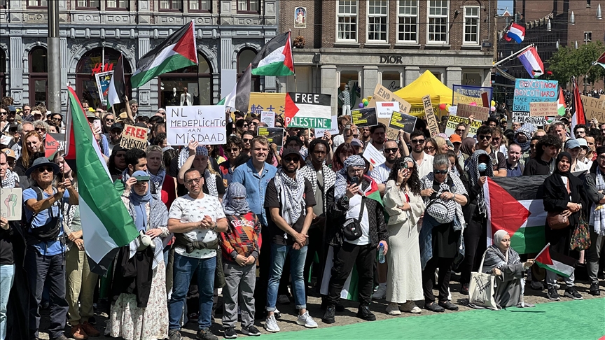 Başkent Amsterdam'daki Dam Meydanı'nda çok sayıda Filistin destekçisi kuruluş tarafından ortaklaşa düzenlenen gösteriye yaklaşık 15 bin kişi katıldı.