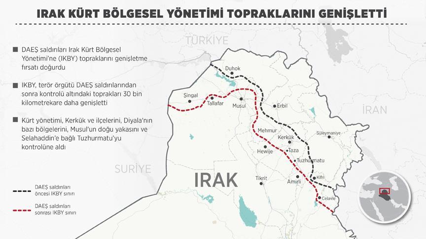 Irak Kürt Bölgesel Yönetimi (IKBY), terör örgütü DAEŞ saldırılarından sonra kontrolü altındaki toprakları 30 bin kilometrekare daha genişletti. Erbil yönetiminin böylelikle hak iddia ettiği 78 bin kilometre karelik sahanın 71 bin kilometrekaresini kontrolü altına aldığı belirtiliyor.