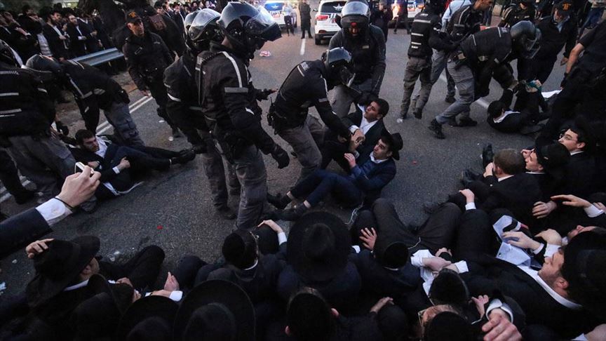 Başkent Tel Aviv'in yakınında yer alan Bney Brak kentinde toplanan çok sayıda Ultra-Ortodoks Yahudi, askere gitmeyi reddeden bir gencin gözaltına alınmasını protesto etti.