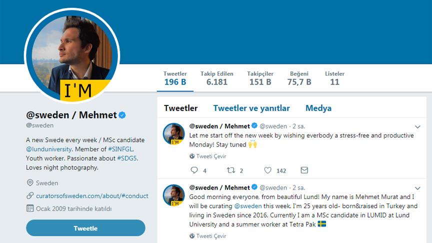 İsveç'in resmi Twitter hesabını bir haftalığına, üniversite öğrencisi 25 yaşındaki Mehmet Murat Doğan yönetecek.