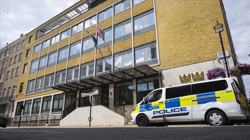 İngiliz polisi de göstericilerin eylemi sırasında büyükelçilik önünde güvenlik önlemleri aldı.