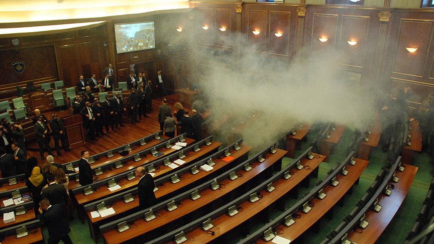 Kosova meclisinde aylardır devam eden hükümet-muhalefet krizi, bugünkü oturumda da muhalefet milletvekillerinin salona gaz bombası atmasıyla sürdü.