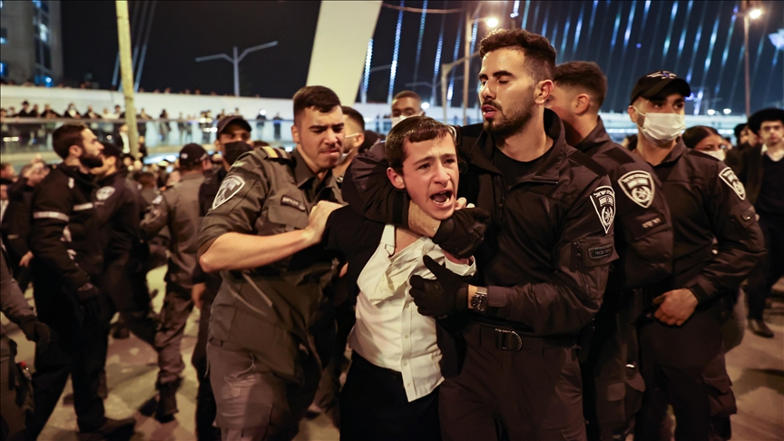 İsrail polisi, göstericileri zorla yoldan çekmeye çalışırken arbede yaşandı. İsrail polisi göstericilere TOMA'dan kimyasal madde katılmış pis kokulu su ve atlı polislerle müdahale etti. Haredi Yahudiler, polislere "Nazi" şeklinde slogan atarak tepki gösterdi.