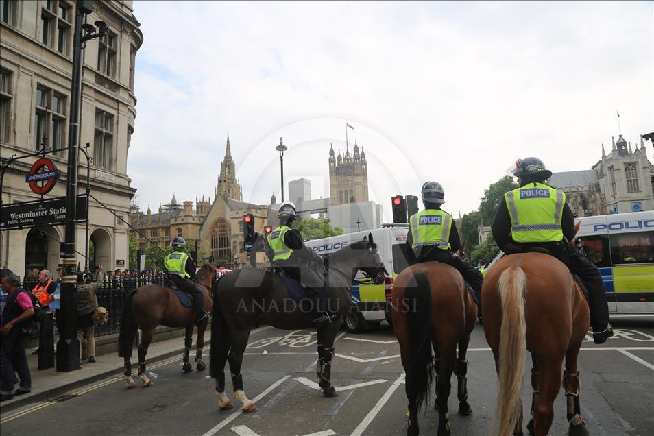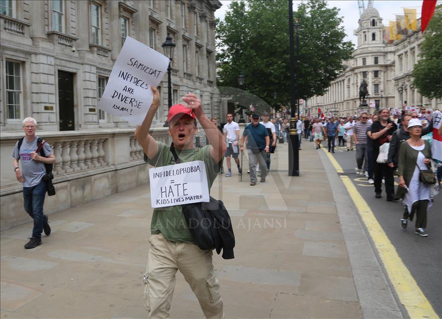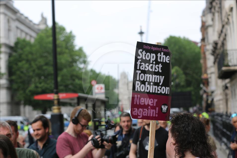 Başbakanlık ofisi “10 Numara”nın bulunduğu Downing Street önünde toplanan binlerce kişi, Robinson’a destek sloganları atarken, taşıdıkları İslam karşıtı pankart ve dövizler dikkati çekti.