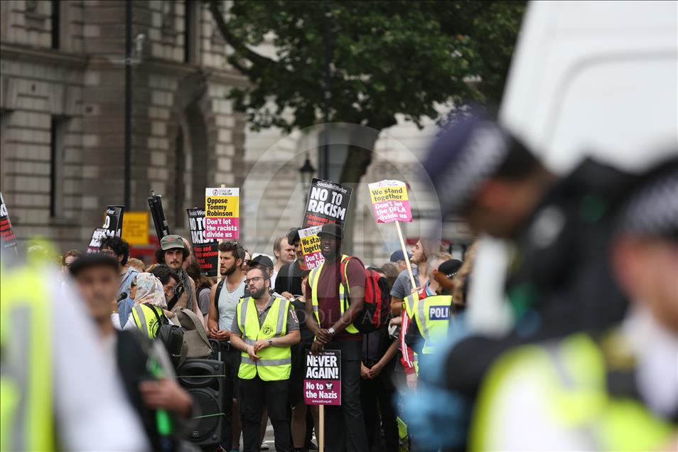 İngiltere’nin başkenti Londra’da hakkında yayın yasağı bulunan bir davada sanıkların kimliklerini ifşa ettiği için önceki hafta tutuklanıp 13 ay hapse mahkum edilen aşırı sağcı İngiliz aktivist Tommy Robinson’ın serbest bırakılması için gösteri düzenlendi. Aşırı sağcı gösterinin yakınında düzenlenen karşı gösteri nedeniyle polis geniş güvenlik önlemleri aldı. ( Tayfun Salcı - Anadolu Ajansı )