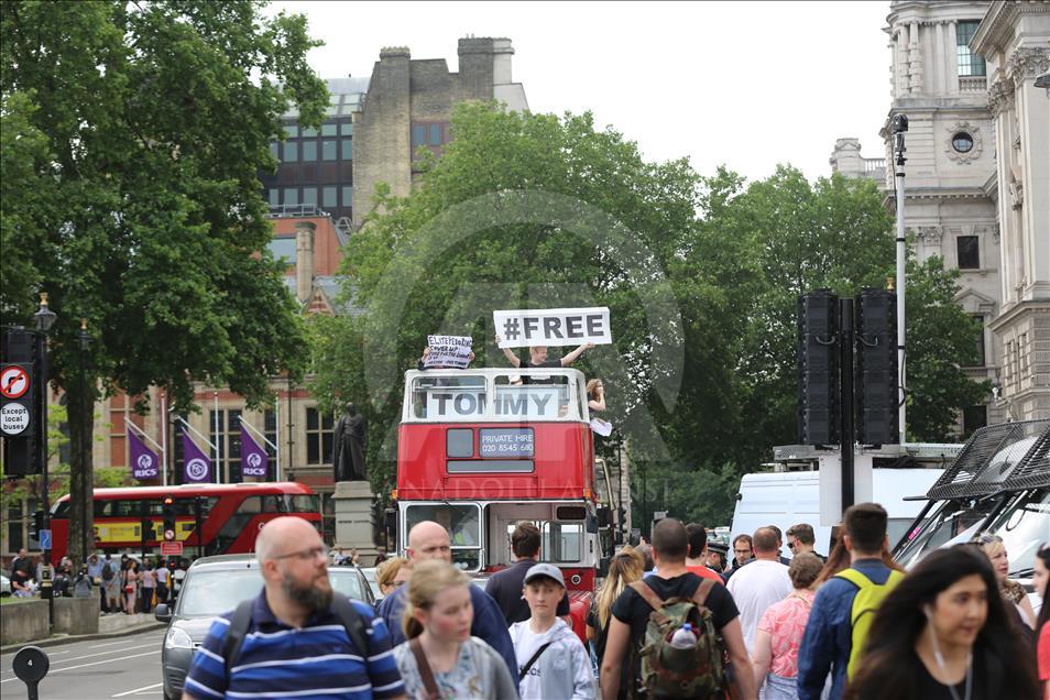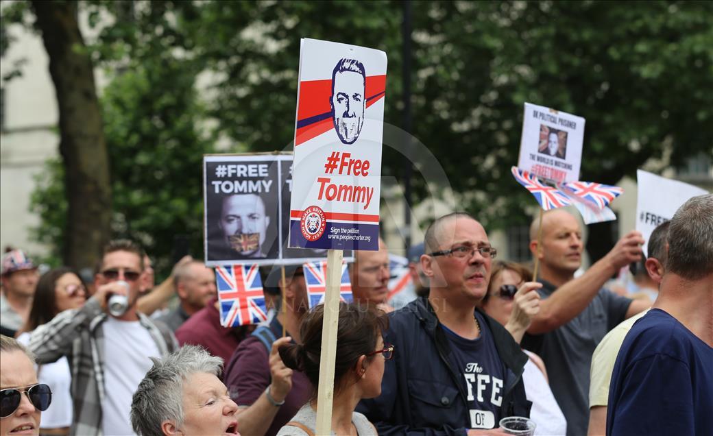 İngiltere’nin başkenti Londra’da hakkında yayın yasağı bulunan bir davada sanıkların kimliklerini ifşa ettiği için önceki hafta tutuklanıp 13 ay hapse mahkum edilen aşırı sağcı İngiliz aktivist Tommy Robinson’ın serbest bırakılması için gösteri düzenlendi.
