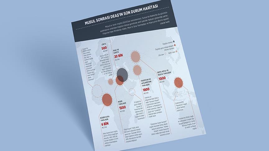 Musul'u kaybedip, Rakka kentinde de önemli derecede güç kaybetmesinin ardından merkez bölgesi Irak ve Suriye'de sıkışan terör örgütü DEAŞ'ın, Kuzey ve Batı Afrika, Orta Asya ile Pasifik Okyanusu'nun batısındaki Güneydoğu Asya'da da uzantıları bulunuyor. DEAŞ bazı ülkelerde halen etkili, bazı ülkelerde ise kendilerine bağlı gruplar olduğunu ilan etse de bunların eylem kapasiteleri düşük.