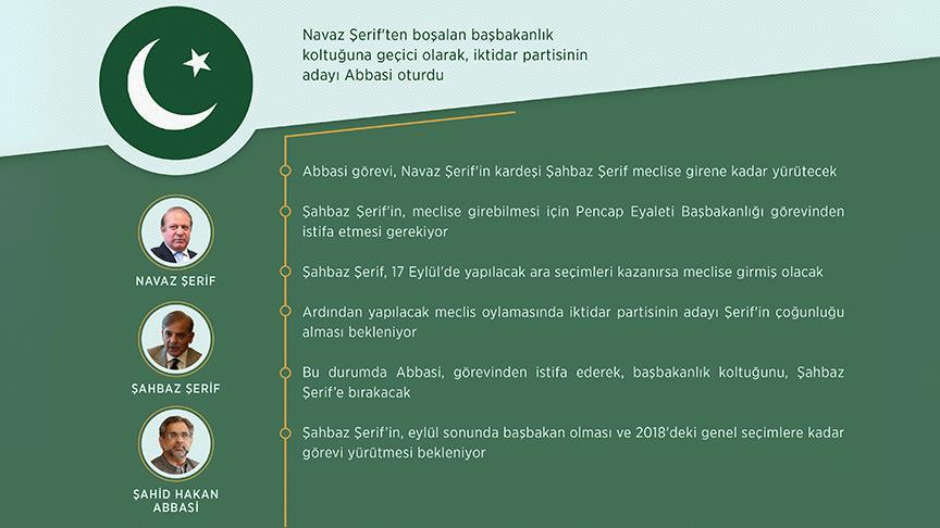 Pakistan'da, Navaz Şerif'ten boşalan başbakanlık koltuğuna, geçici olarak, eski Petrol ve Doğal Kaynaklar Bakanı Şahid Hakan Abbasi oturdu. Abbasi'nin görevi, Şerif'in kardeşi Şahbaz Şerif’e devretmesi öngörülüyor.